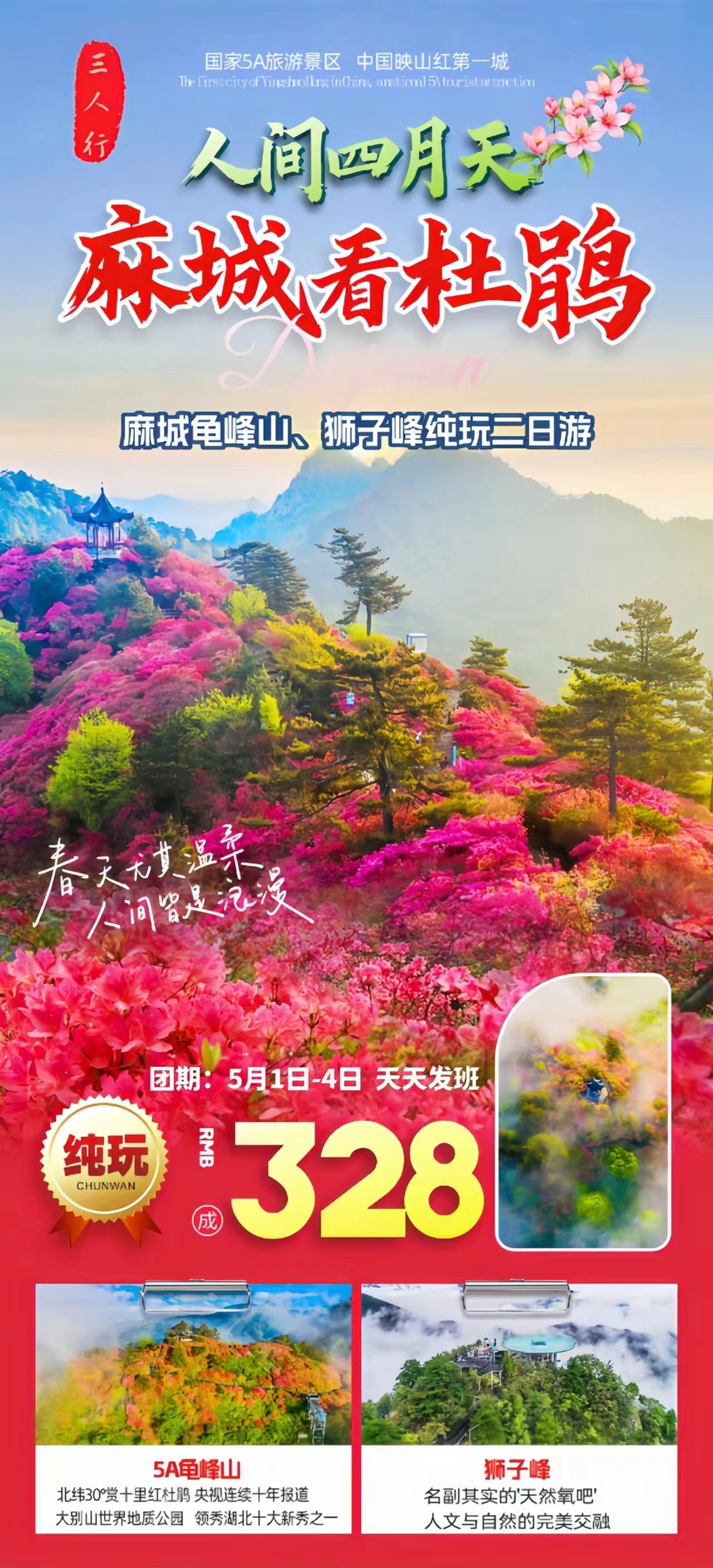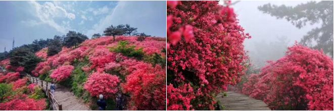 D1:早上指定地点(7:00 武汉剧院,7:20 徐东万象汇,7:40 小龟山地铁站)集合前往 【龟峰山国家 5A 级景区】。这是麻城旅游最大的亮点,是吉尼斯认证的世界之最。就是说,虽然杜鹃花哪儿都有,但全世界其它任何地方都看不到麻城如此壮观、如此美丽的杜鹃花海洋。